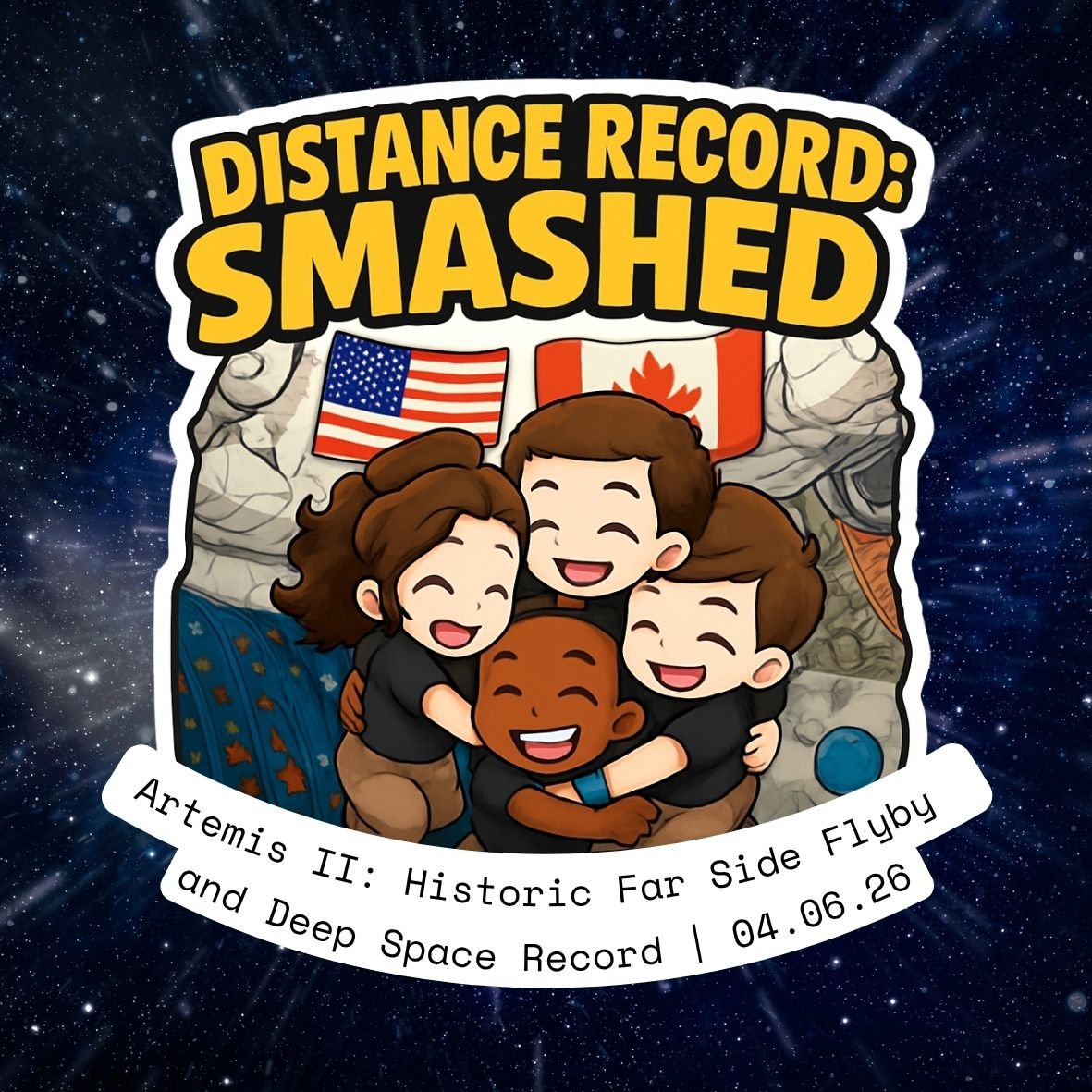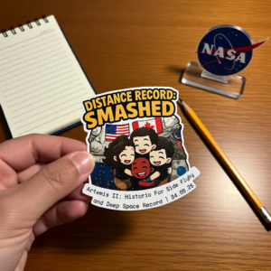 On April 6, 2026, the Artemis II crew didn’t just fly by the Moon—they shattered records. This commemorative sticker captures the joy of that historic milestone, featuring a stylized illustration of the four-person crew celebrating their achievement in deep space.