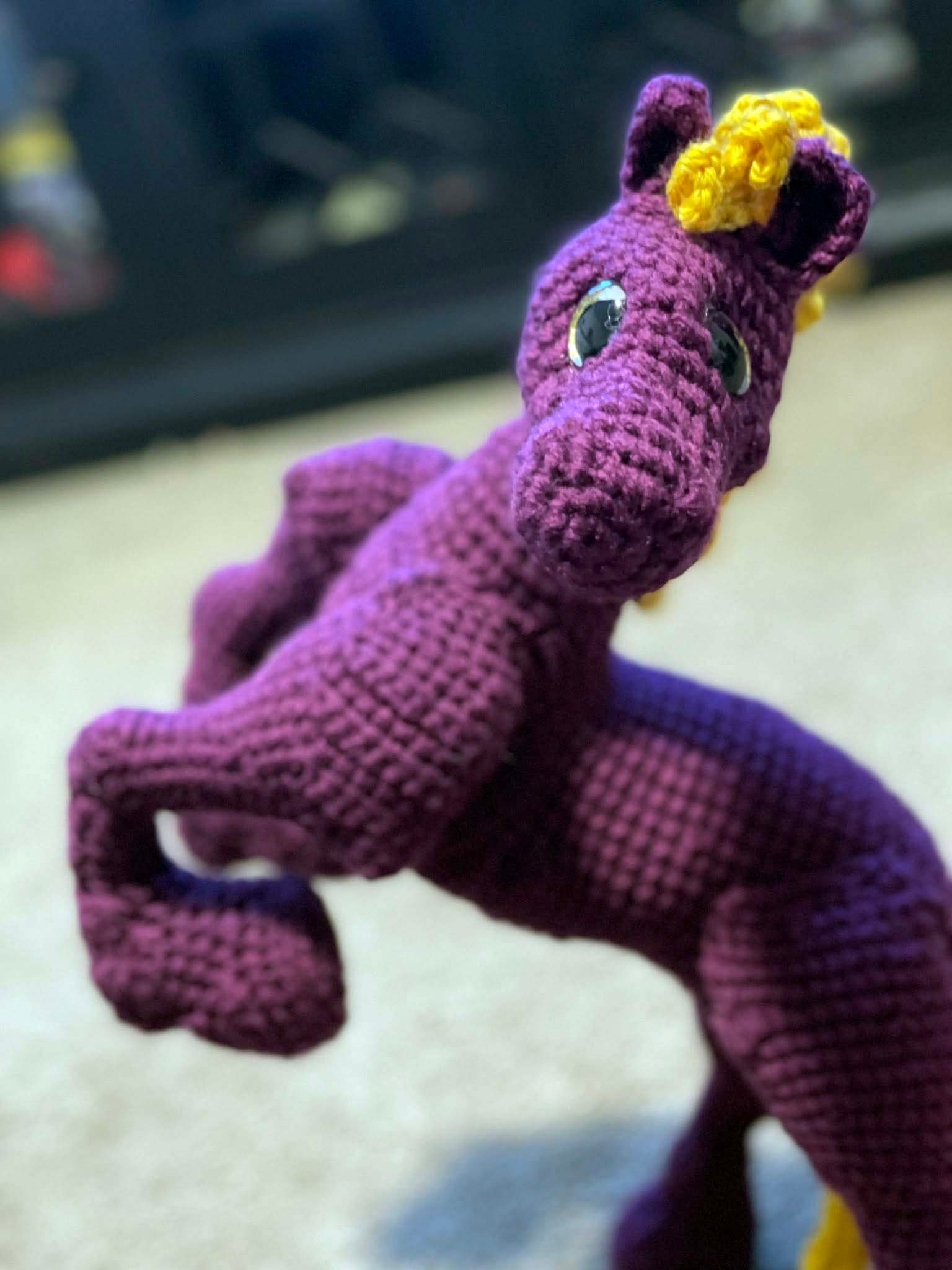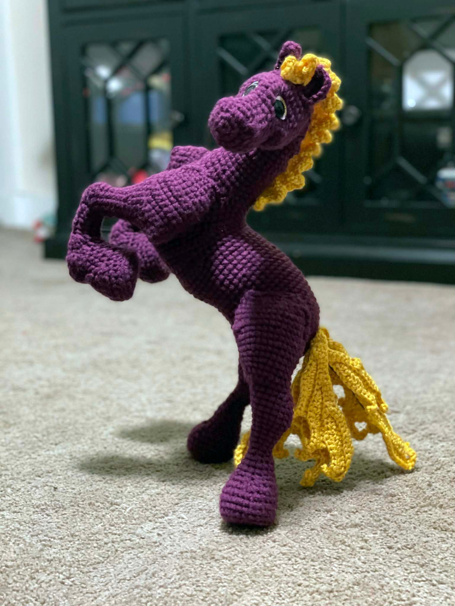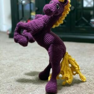 The perfect gift for students, alumni, and fans! This hand-crocheted horse celebrates the BMR spirit, captured in a dynamic rearing silhouette. Using acrylic purple yarn with a vibrant golden-yellow mane and tail, this piece is designed to stand out on a desk, shelf, or trophy case. Whether you’re celebrating graduation, a big win, or just want to show your hometown pride, this handmade mascot brings a touch of handmade charm to the Charger community.